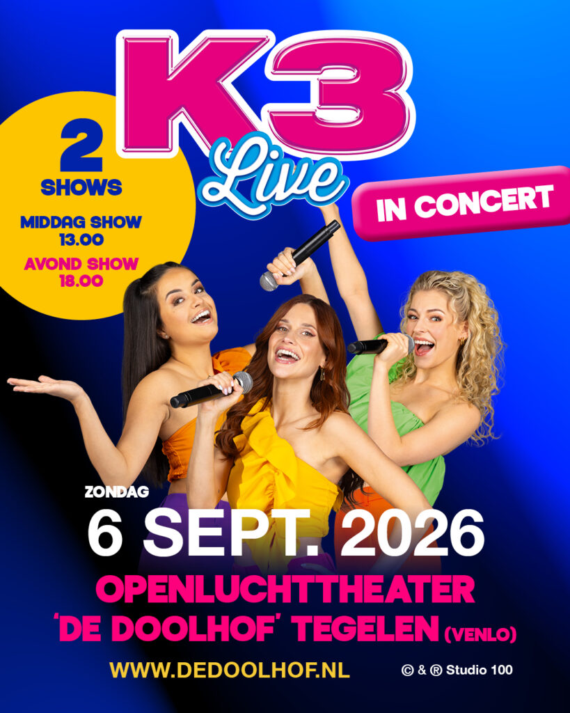๐๐ฎ๐ป๐ป๐ฒ, ๐ ๐ฎ๐ฟ๐๐ต๐ฒ ๐ฒ๐ป ๐๐๐น๐ถ๐ฎ brengen een volledig liveconcert mรฉt uitgebreide liveband naar dit sfeervolle openluchttheater. Ruim 26 jaar nadat K3 werd opgericht, zorgen de drie voor wat ze het allerbeste kunnen: mensen blij maken met hun vrolijke, aanstekelijke muziek. Dit keer richten ze zich niet alleen op de allerkleinste fans, maar juist ook op iedereen die is opgegroeid met klassiekers als โOya Lรฉlรฉโ en โAlle Kleurenโ. Tijdens deze show passeren alle grote hits รฉn nieuwe nummers de revue โ verpakt in een energiek, kleurrijk en verrassend liveconcert.
